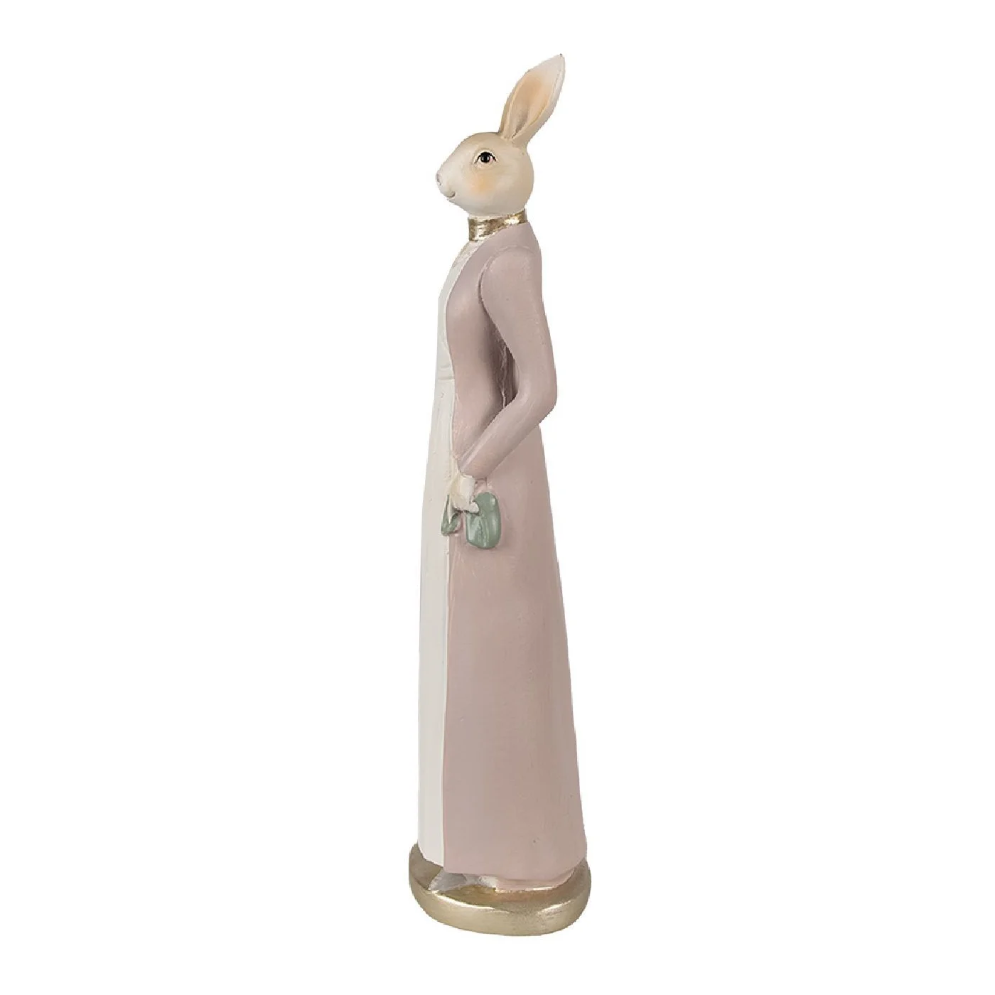 Die handbemalte Skulptur beeindruckt durch ihre Detailverliebtheit, von den sanften beige und rosa Farbtönen bis hin zu den sorgfältig aufgetragenen goldenen Akzenten, die das Gesamtbild stilvoll abrunden. Das Design verbindet die Rustikalität des Landhausstils mit einem Hauch von Eleganz, wodurch diese Figur vielseitig einsetzbar ist – sei es als zentrales Dekoelement auf einer Anrichte, als heiterer Begleiter auf dem Schreibtisch oder als Teil einer größeren Dekorationskomposition zu verschiedenen Anlässen. Die Verwendung von Polyresin garantiert zudem eine lange Haltbarkeit und einfache Reinigung.